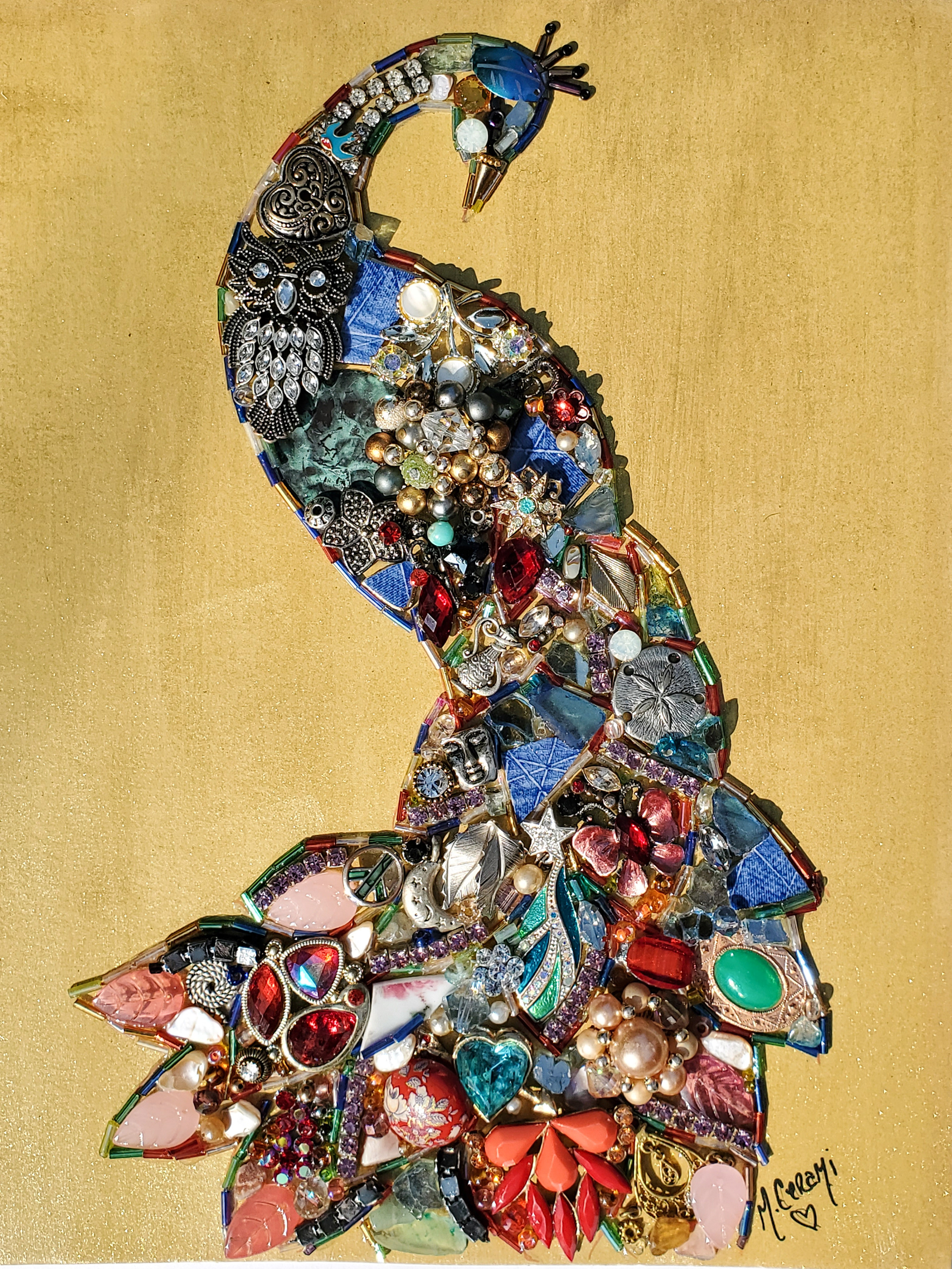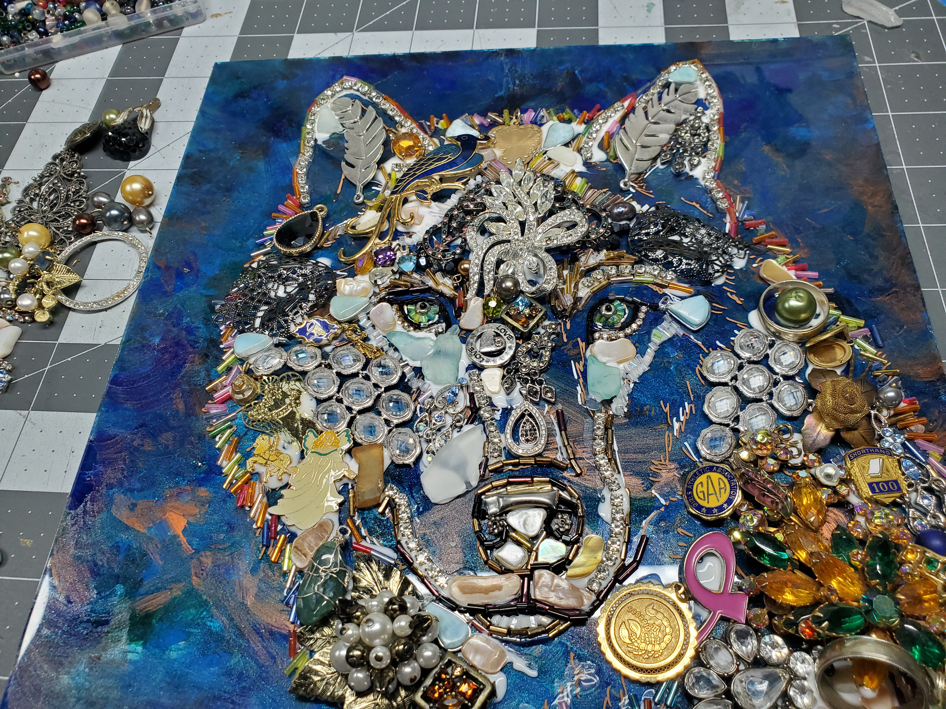 Once my substrate is prepared, each element from my vast collection is individually and intentionally hand-set. This process can take tedious hours and many days to complete. I work with beads and elements from just 1 mm and up - this process is very time intensive and is how my work takes on a life of its own.