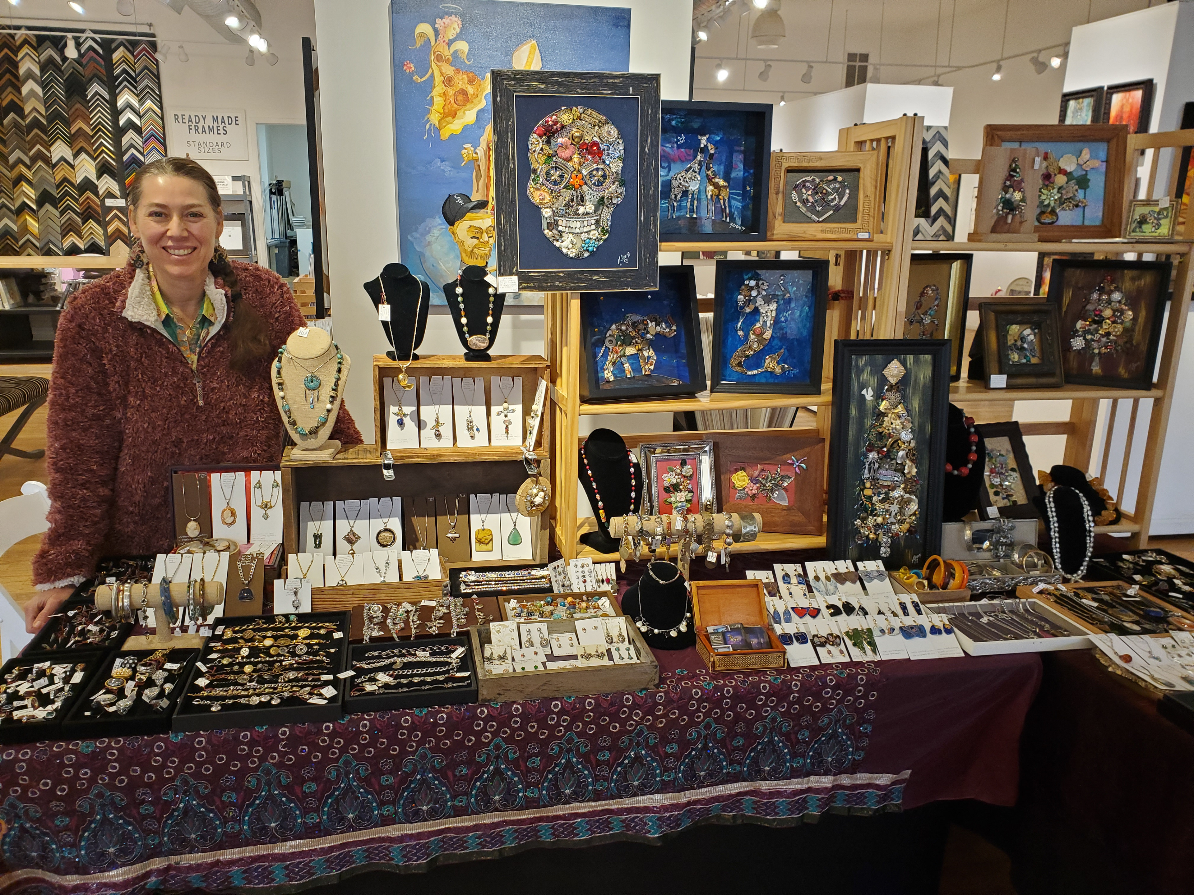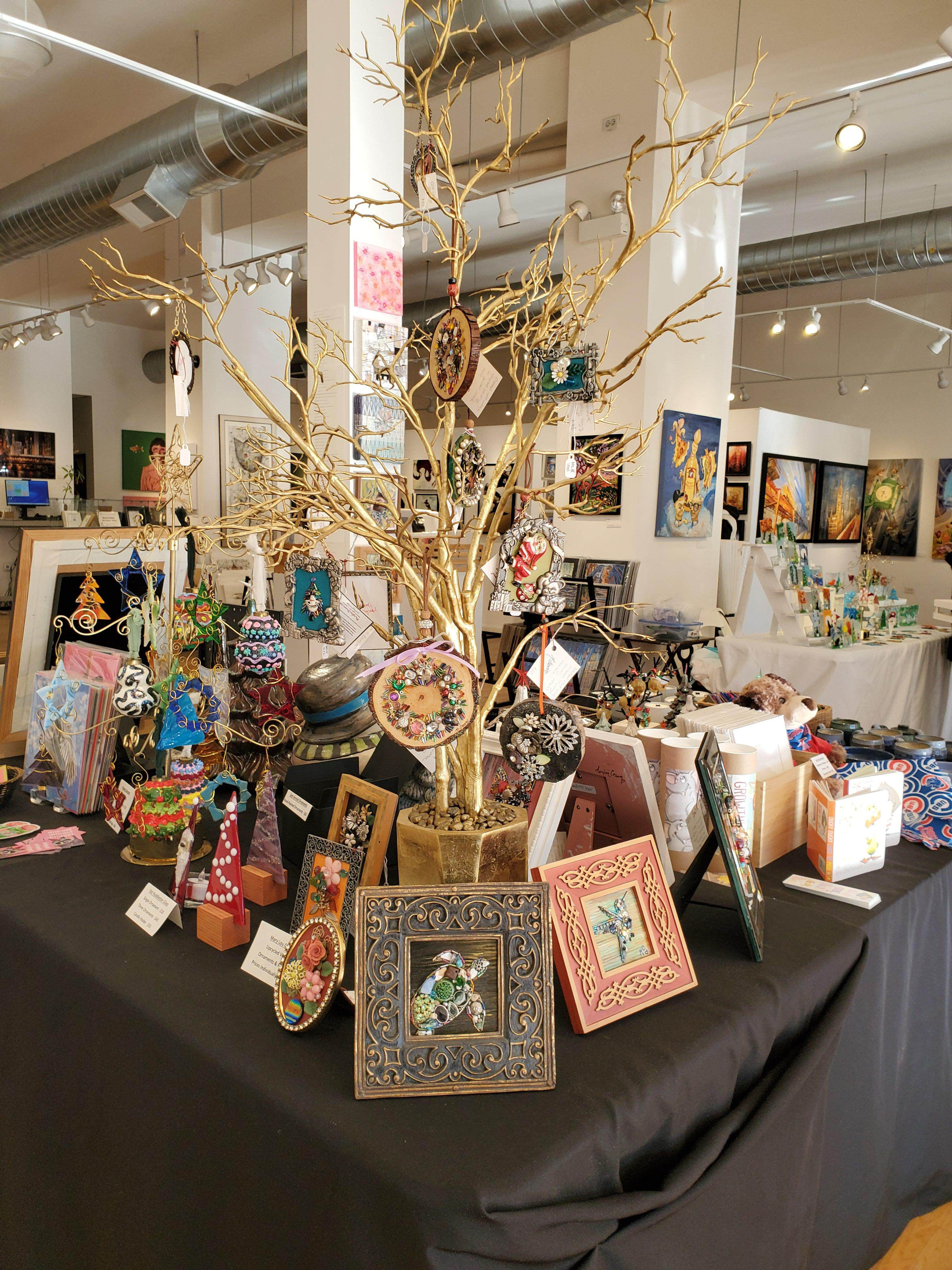 I displayed my mini framed art pieces and hanging ornaments on the Holiday Table right in the gallery for the duration of the show.